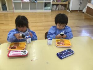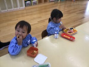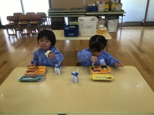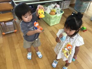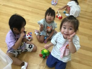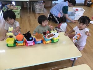 お友達と一緒におもちゃで遊んだり、自分でスモックを着て、