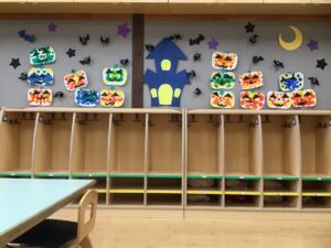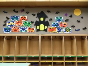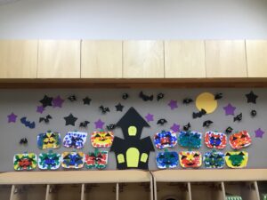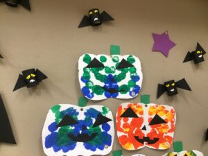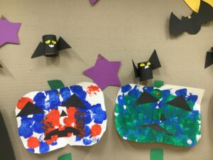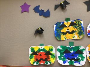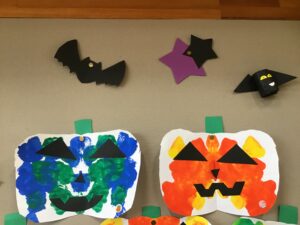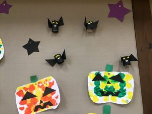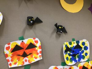 かぼちゃの製作では初めて重ね切りとデカルコマニーに挑戦しました!黒い線の上を丁寧に切り、かぼちゃの形に切ることができました♪デカルコマニーでは好きな色を二色選び、自分だけのかぼちゃを作ることができました!