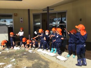 朝から中庭に雪が積もっているのを見て、子ども達は雪に興味津々!!