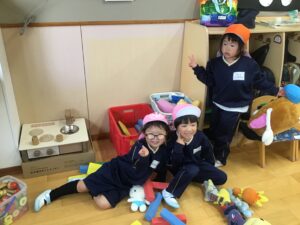 宝探しやじゃんけん列車をした後は、塗り絵や人形など玩具をだして遊びました!