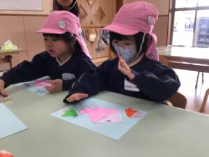 魚を折ったり、指輪を折ったり、、、好きな色を選んで色々な折り紙を折りました!