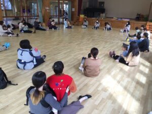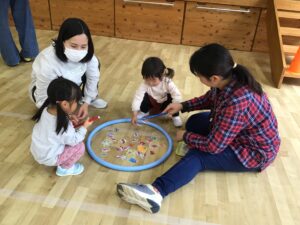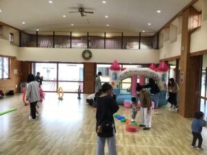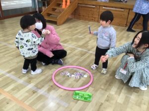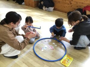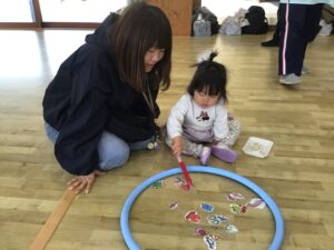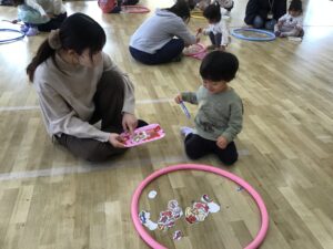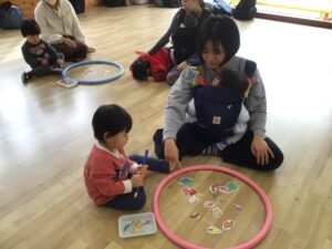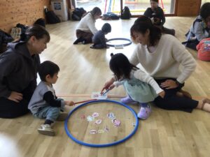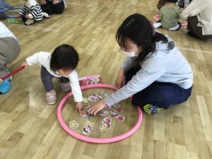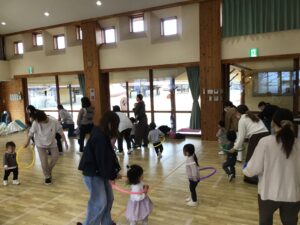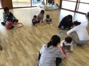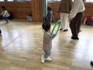 フープをハンドルに見立ててドライブをしたり、フープの中に入って電車に変身し、お家の人と連結して走ったりと楽しく体をたくさん動かすことが出来ました♪